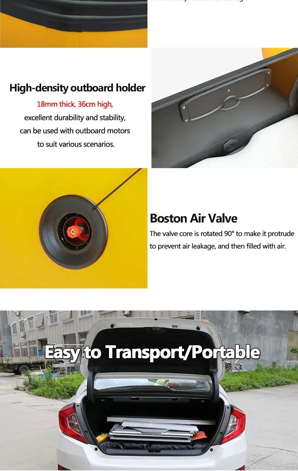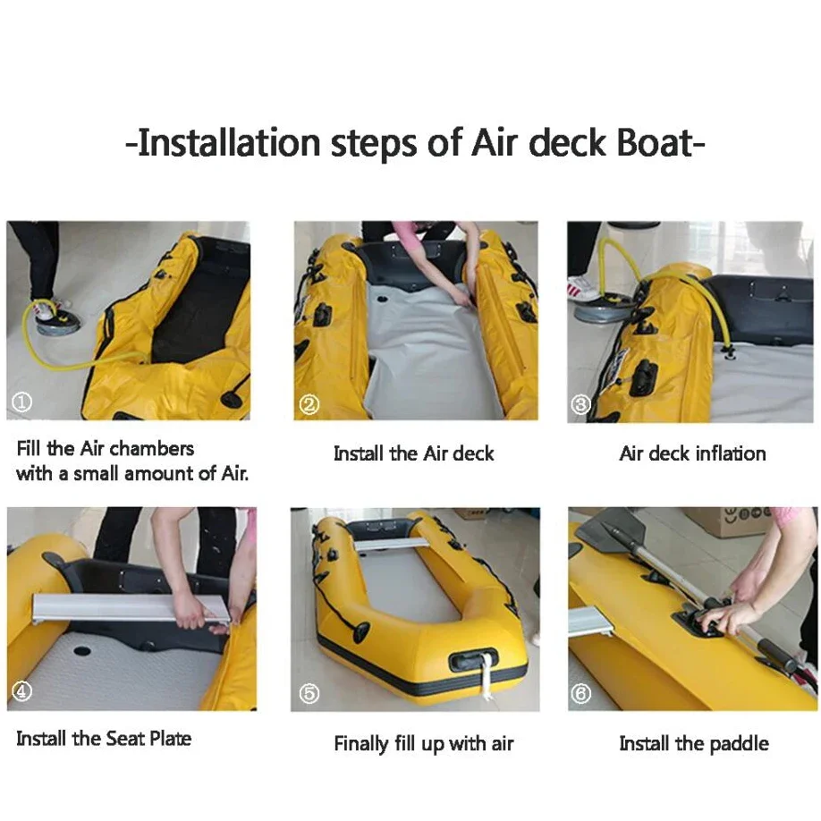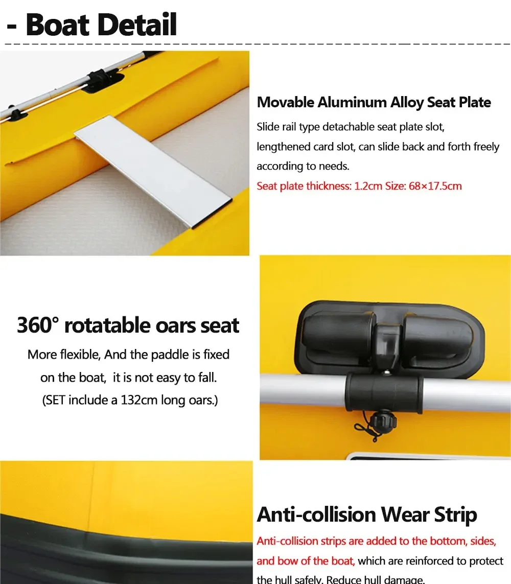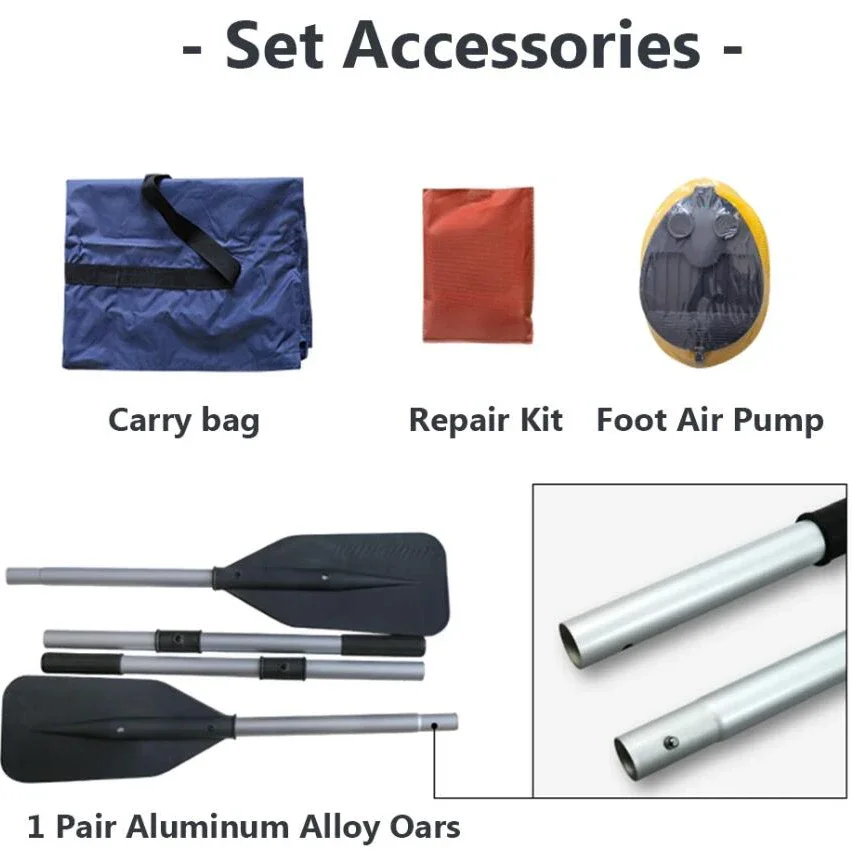 ●Set Included: PVC Hull, Air deck x 1, Movable Aluminum Alloy Seat Plate x 1, Alloy oars x 1 pair, Carry bag x 1,Foot air pump x 1,Repair kit x 1